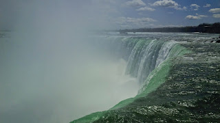 Niagara falls - the horseshoe falls- from the canadian side. Sunshine, blue skies and water mist that is only just above freezing. There is still snow or ice on the banks below the falls and blocks of river ice the size of surfboards are going over every few seconds